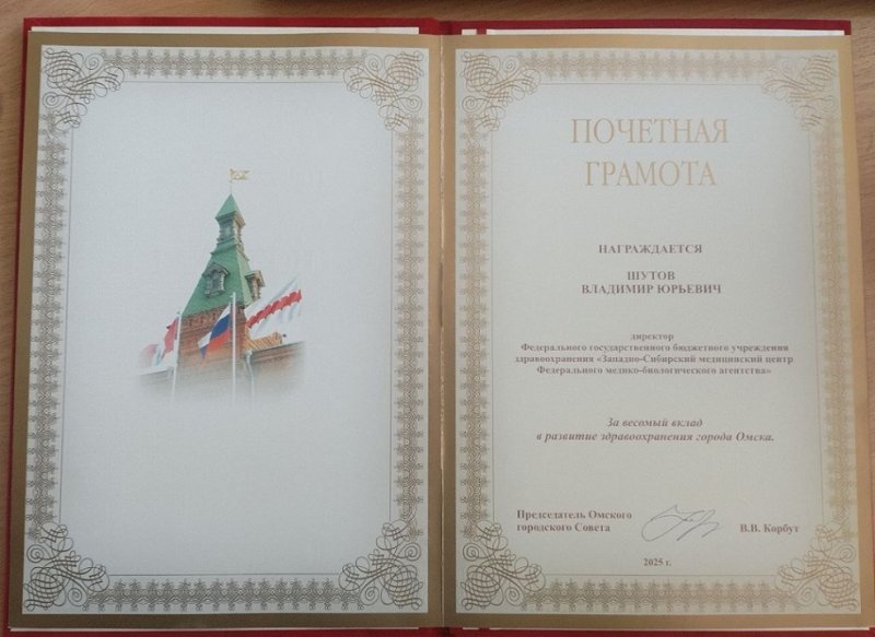За весомый вклад в развитие здравоохранения города Омска Почетной грамотой Омского Городского Совета награжден директор Западно-Сибирского медицинского центра ФМБА России Владимир Юрьевич Шутов. От имени Председателя Омского городского Совета Владимира Валентиновича Корбута Почетную грамоту Владимиру Юрьевичу вручил депутат Городского совета Сергей Петрович Фролов.